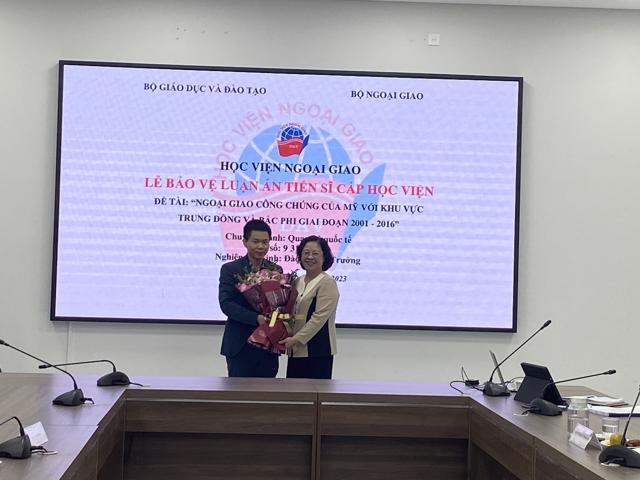 Ngày 16/05/2023, tại Học viện Ngoại giao, nghiên cứu sinh (NCS) Đào Quyền Trưởng đã bảo vệ thành công luận án tiến sĩ cấp Học viện chuyên ngành Quan hệ quốc tế, mã số 9.31.02.06 với đề tài “Ngoại giao công chúng của Mỹ với khu vực Trung Đông và Bắc Phi giai đoạn 2001 - 2016”, dưới sự hướng dẫn khoa học của PGS.TS. Nguyễn Thị Thanh Thủy và PGS.TS. Lê Hải Bình.