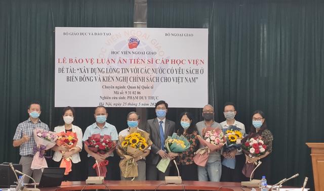 Ngày 25/05/2021, tại Học viện Ngoại giao nghiên cứu sinh (NCS) Phạm Duy Thực đã bảo vệ thành công luận án tiến sĩ cấp Học viện chuyên ngành Quan hệ quốc tế, mã số 9.31.02.06 với đề tài “Xây dựng lòng tin giữa các nước có yêu sách ở Biển Đông và kiến nghị chính sách cho Việt Nam”, dưới sự hướng dẫn khoa học của GS.TS. Nguyễn Vũ Tùng.