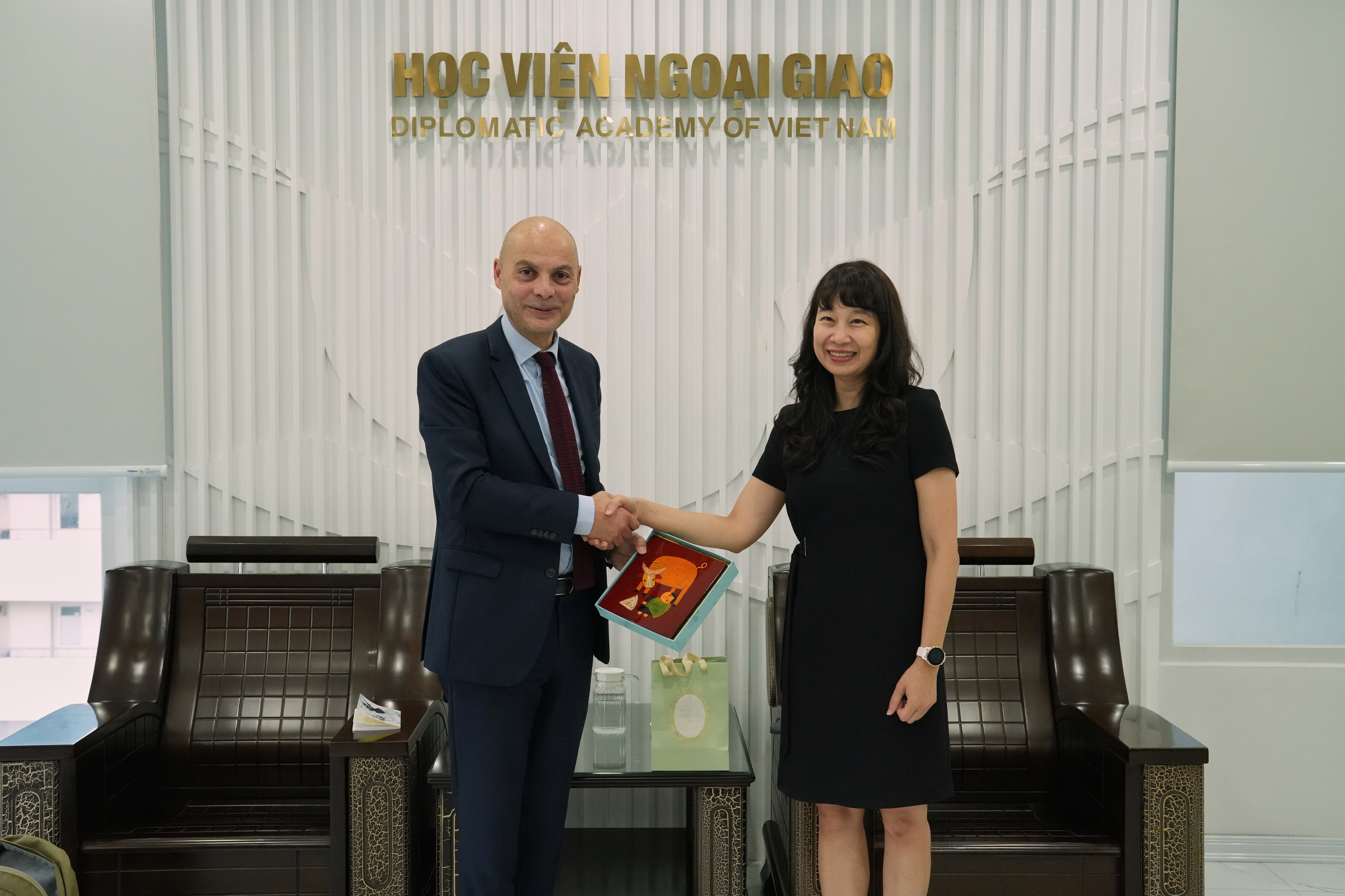 Mở đầu buổi tiếp, PGS. TS. Nguyễn Thị Lan Anh bày tỏ vui mừng được đón tiếp Ngài Didier Le Bret và đoàn công tác của Học viện Ngoại giao Bộ Châu Âu và Ngoại giao Pháp. Bà giới thiệu khái quát về chức năng, nhiệm vụ và các hoạt động trọng tâm của Học viện Ngoại giao Việt Nam, bao gồm đào tạo đại học và sau đại học; bồi dưỡng cán bộ đối ngoại; nghiên cứu và tư vấn chính sách cho Bộ Ngoại giao. Phó Giám đốc cũng chia sẻ định hướng phát triển của Học viện trong thời gian tới, mở rộng mạng lưới hợp tác học thuật và tăng cường trao đổi chuyên gia với các đối tác quốc tế.