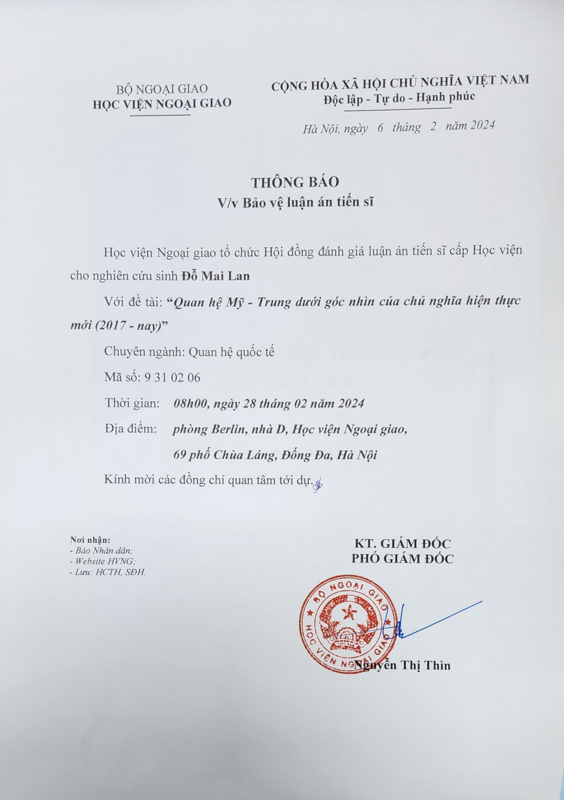 Quyết định về việc công nhận kết quả tuyển sinh đào tạo trình độ tiến sĩ chuyên ngành Quan hệ quốc tế năm 2023 22/12/2023