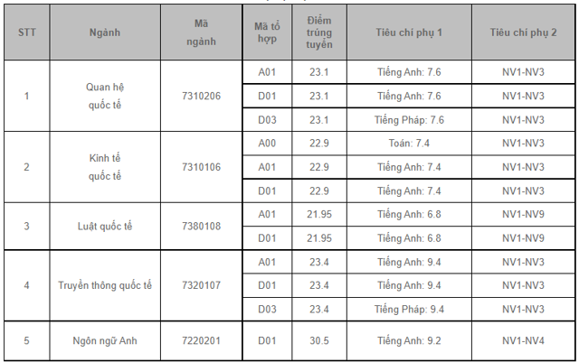 - Đối với các ngành có tổ hợp môn thi dùng để xét tuyển không nhân hệ số (ngành Quan hệ quốc tế, Truyền thông quốc tế, Kinh tế quốc tế, Luật quốc tế), điểm xét tuyển là tổng điểm của 3 môn thi cộng với điểm ưu tiên đối tượng, khu vực theo quy định của Bộ Giáo dục và Đào tạo. Mức điểm được làm tròn đến hai chữ số thập phân.