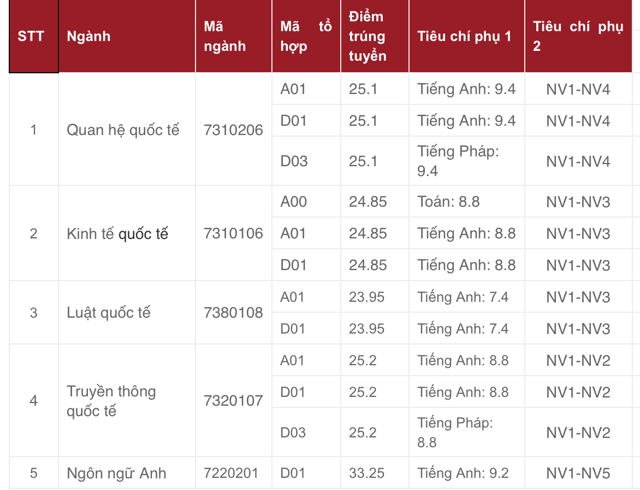 - Đối với các ngành có tổ hợp môn thi dùng để xét tuyển không nhân hệ số (ngành Quan hệ quốc tế, Truyền thông quốc tế, Kinh tế quốc tế, Luật quốc tế), điểm xét tuyển là tổng điểm của 3 môn thi cộng với điểm ưu tiên đối tượng, khu vực theo quy định của Bộ Giáo dục và Đào tạo. Mức điểm được làm tròn đến hai chữ số thập phân.