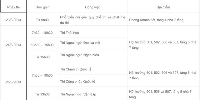 Lịch thi tuyển sinh Thạc sĩ chuyên ngành Quan hệ quốc tế và Luật quốc tế đợt II - 2013