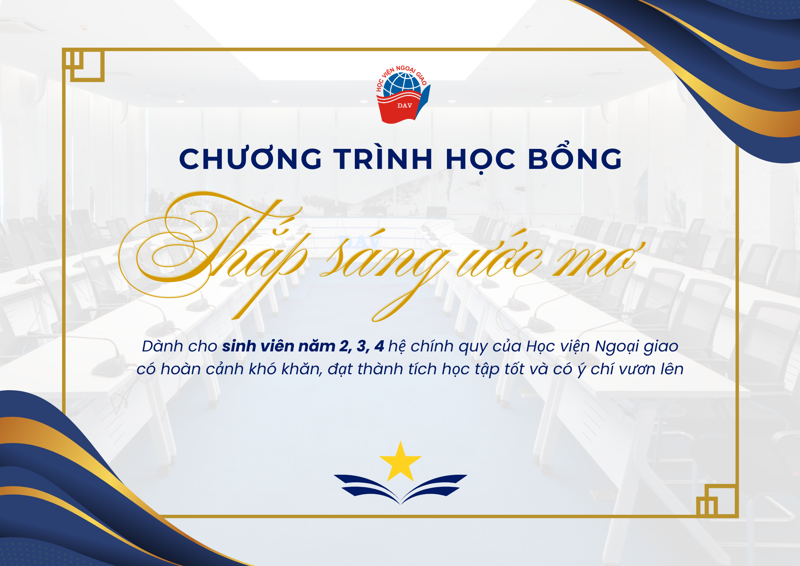 Học viện Ngoại giao trân trọng thông báo Chương trình Học bổng "Thắp sáng Ước mơ" năm học 2025 - 2026, dành cho sinh viên năm 2,3,4 có hoàn cảnh khó khăn và đạt thành tích học tập tốt, vươn lên trong học tập.