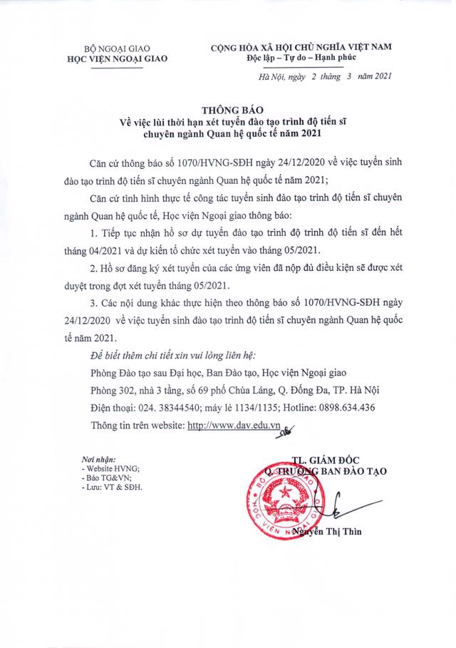 Đào tạoTiến sĩ Thông báo về việc lùi thời hạn xét tuyển đào tạo trình độ tiến sĩ chuyên ngành Quan hệ quốc tế năm 2021 00:00 05/09/2021 Tweet