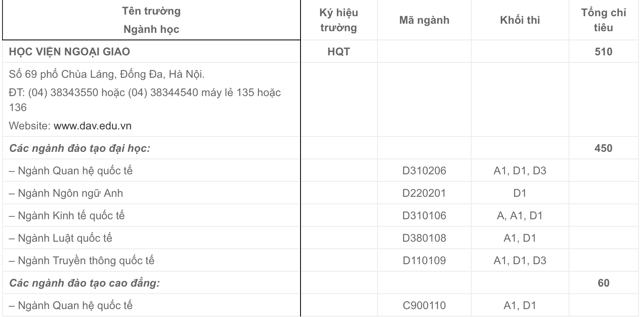 - Trong số thí sinh trúng tuyển, Học viện xét 125 sinh viên có nguyện vọng học hệ đào tạo chất lượng cao các ngành: Quan hệ quốc tế, Luật quốc tế, Kinh tế quốc tế, Truyền thông quốc tế và Ngôn ngữ Anh. Thông tin chi tiết về đào tạo hệ chất lượng cao xem thêm trên website: www.dav.edu.vn.
