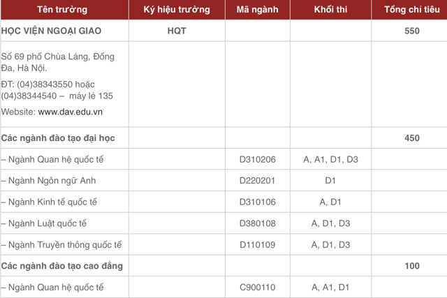 - Ngành Quan hệ quốc tế giữa Học viện Ngoại giao và Đại học Victoria, Wellington, New Zealand theo mô hình 1.5 năm học tại Học viện Ngoại giao và 1.5 năm học tại Đại học Victoria, New Zealand được Bộ Giáo dục và Đào tạo cấp phép. Thông tin chi tiết về điều kiện xét tuyển, học phí, học bổng … liên hệ theo số điện thoại 04 38343550 hoặc trên website: www.dav.edu.vn.